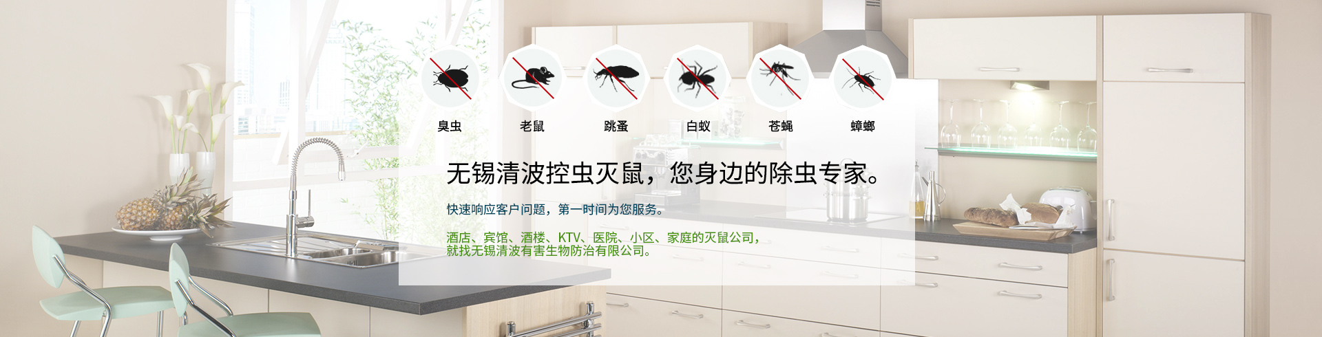 本專業為超市、酒店、商場、醫院、工廠、倉庫、學校、賓館、餐廳、辦公樓、家庭等客戶提供蟲害管理服務,如滅老鼠、殺蟑螂、滅跳蚤、防治白蟻等。